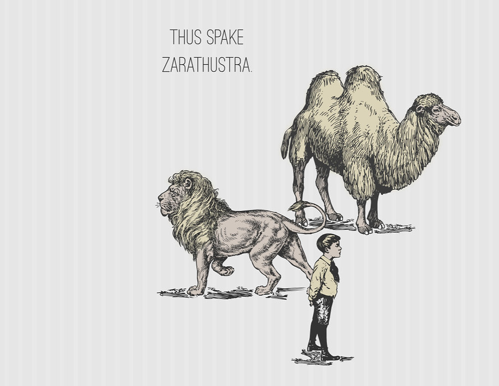 In Thus Spoke Zarathustra, Nietzsche presents both a philosophical allegory and a personal biography. The three metamorphoses, the camel, the lion, and the child, symbolize the evolutionary stages of the spirit in its struggle for freedom and creativity.